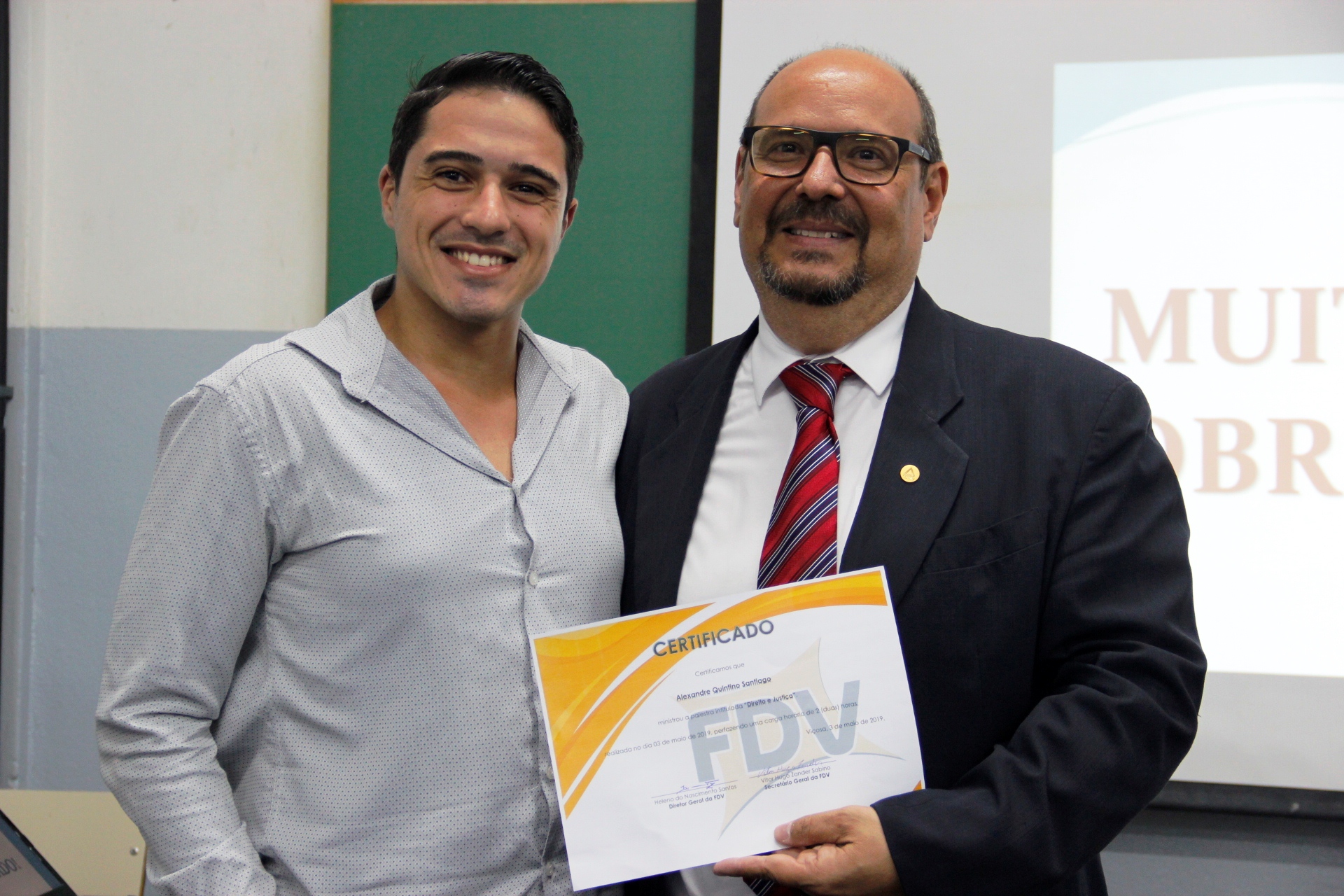 O curso de Direito da FDV, com o objetivo de oferecer uma formação acadêmica complementar para os alunos, professores da FDV e o público externo, promoveu a palestra no dia 03 de maio de 2019, às 19 horas com a temática “Direito e Justiça” que foi ministrada pelo Desembargador Alexandre Quintino Santiago da 11º Câmara Cível do Tribunal de Justiça de Minas Gerais. O objetivo precípuo escolhido como tema para a palestra foi a condução dos primeiros institutos jurídicos e carreiras jurídicas para os alunos do primeiro período do curso de Direito da FDV.