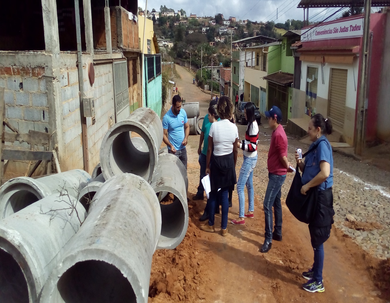 Estudantes de Engenharia Ambiental visitam sistema de drenagem no bairro Nova Viçosa.