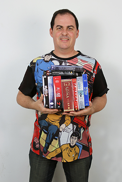 Uma de suas paixões declaradas (o que explica um pouco a foto deste portrait) é a área de Cinema. Não por acaso também leciona na FDV, para o curso de Publicidade e Propaganda, uma disciplina com este nome. Filmes e séries de TV (nacionais e internacionais) são presenças garantidas em seu cotidiano. O professor menciona que nos últimos anos tem acompanhado uma média de dez séries diferentes por semana.